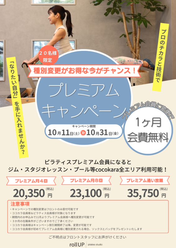 ココカラ会員様&ピラティス会員様がピラティスプレミアム会員に種別変更をすると、【1か月会費が無料になります!】