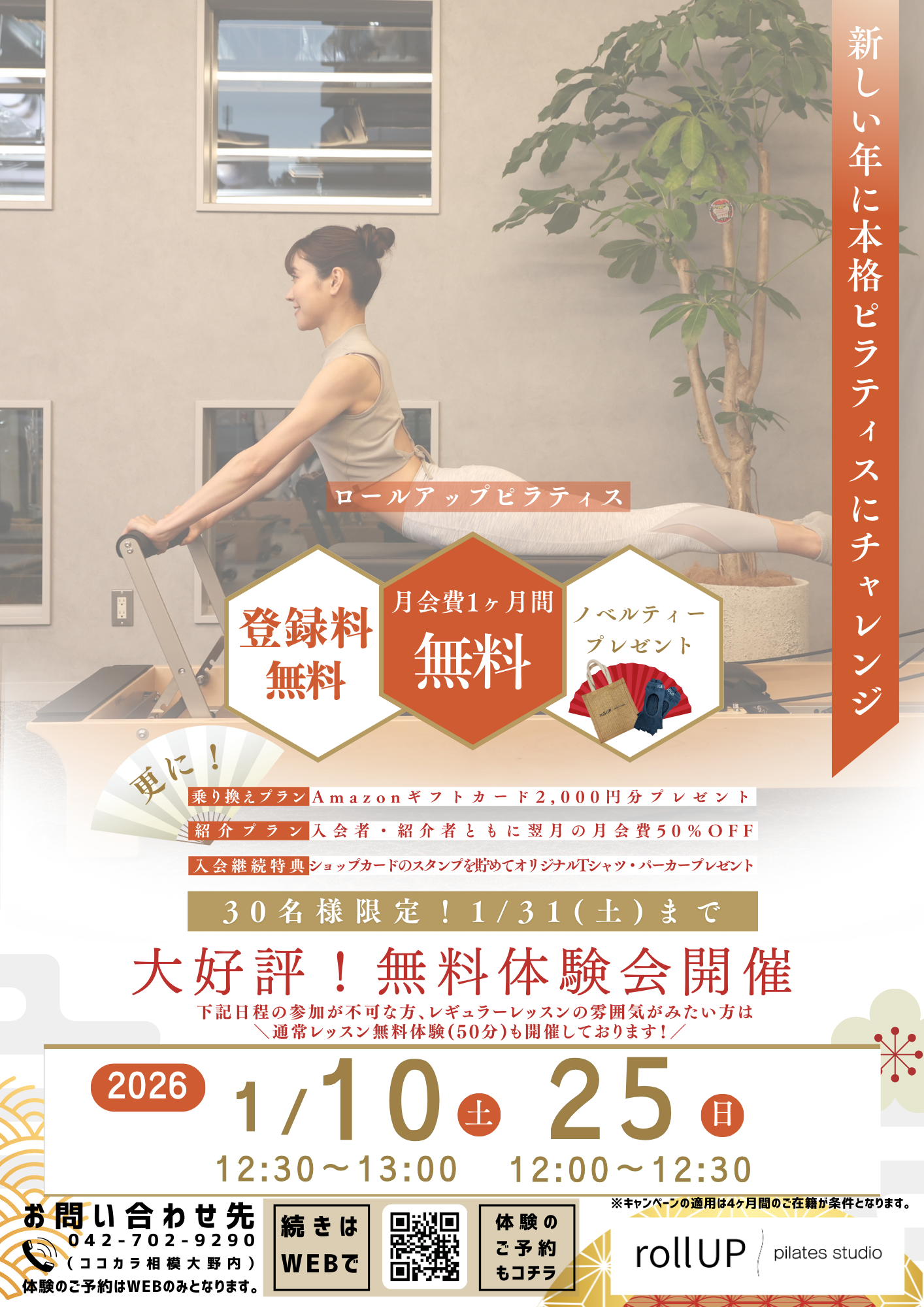 只今、ロールアップピラティススタジオではお得な入会キャンペーンを実施しております!